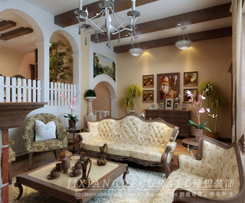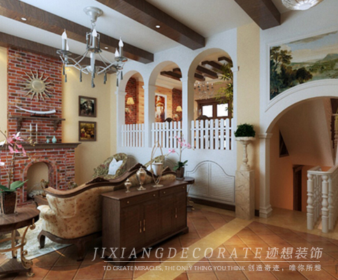 本案例整體采用了美式鄉(xiāng)村的裝修風格,大量采用了壁爐,拱形,紅磚等經典元素,搭以碎花窗簾,油畫作為點綴。