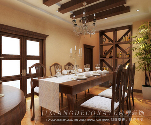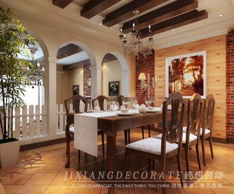 餐廳與客廳在 吊頂,掛畫處相互呼應,紅磚墻面,實木家具顯出濃濃的沒是鄉(xiāng)村風格;